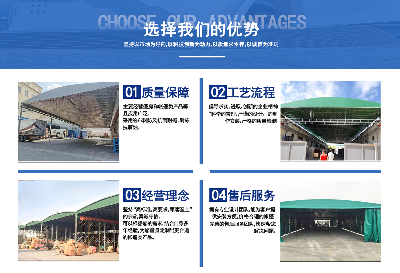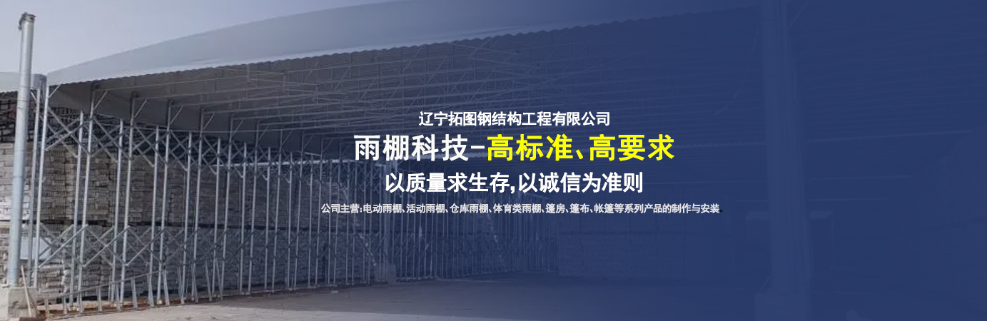 遼寧拓圖鋼結(jié)構(gòu)工程有限公司是一家專業(yè)從事推拉篷設(shè)計(jì)、制作、安裝、使用、維修的綜合性公司。公司主營(yíng):電動(dòng)雨棚、活動(dòng)雨棚、倉(cāng)庫(kù)雨棚、體育類雨棚、篷房、篷布、帳篷等系列產(chǎn)品的制作與安裝。 遼寧拓圖鋼結(jié)構(gòu)工程有限公司堅(jiān)持以市場(chǎng)為導(dǎo)向,以科技創(chuàng)新為動(dòng)力,以質(zhì)量求生存,以誠(chéng)信為準(zhǔn)則,倡導(dǎo)求實(shí)、進(jìn)取、創(chuàng)新的企業(yè)精神?!翱茖W(xué)的管理、嚴(yán)謹(jǐn)?shù)脑O(shè)計(jì)、 的制作安裝、嚴(yán)格的質(zhì)量檢測(cè)、良好的后期服務(wù)成就企業(yè)的信譽(yù),為您提供優(yōu)質(zhì)服務(wù)?! ?nbsp; 遼寧拓圖鋼結(jié)構(gòu)工程有限公司傾力于開(kāi)發(fā)應(yīng)用三維空間結(jié)構(gòu)與新材料的結(jié)合,將廣告藝術(shù)視覺(jué)表現(xiàn)形式與張力膜材科學(xué)的結(jié)合,推出多彩推拉蓬,依靠先進(jìn)的科學(xué)技術(shù),將推拉蓬建筑表現(xiàn)形式無(wú)限延伸,立志走在建筑科學(xué)的前沿,引導(dǎo)建筑時(shí)尚潮流,我們的目標(biāo)是使推拉蓬建筑在中國(guó)發(fā)展壯大?! ?nbsp; 遼寧拓圖鋼結(jié)構(gòu)工程有限公司憑著極強(qiáng)的事業(yè)熱情和豐富的專業(yè)經(jīng)驗(yàn)以“勤勉進(jìn)取、銳意創(chuàng)新、至誠(chéng)至信”的精神使公司得到迅速健康發(fā)展,業(yè)務(wù)范圍遍及全國(guó)。科學(xué)的管理、嚴(yán)謹(jǐn)?shù)脑O(shè)計(jì)、高標(biāo)準(zhǔn)的制作安裝流程,嚴(yán)格把控產(chǎn)品質(zhì)量,熱誠(chéng)的售后服務(wù)是企業(yè)競(jìng)爭(zhēng)力的源泉?! ?nbsp; 遼寧拓圖鋼結(jié)構(gòu)工程有限公司人愿以最誠(chéng)摯的態(tài)度,歡迎廣大客戶的蒞臨與溝通!愿為市場(chǎng)提供優(yōu)...